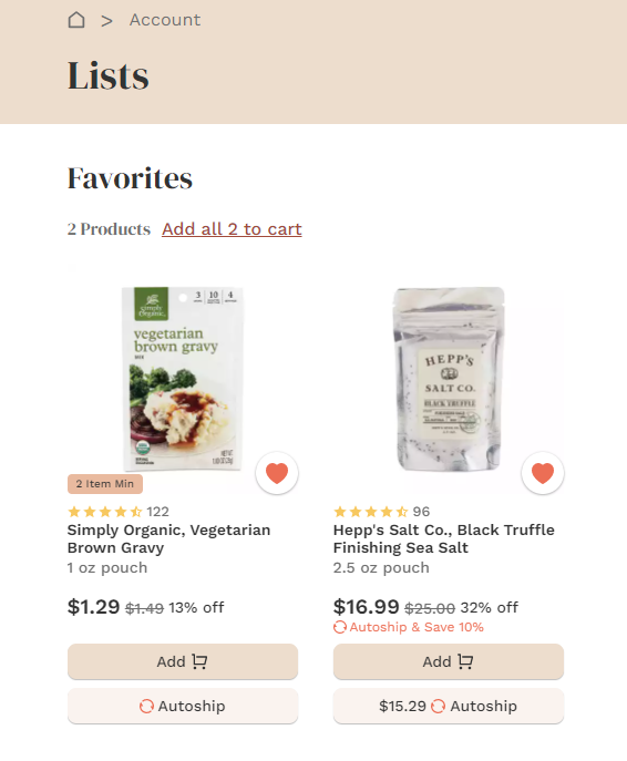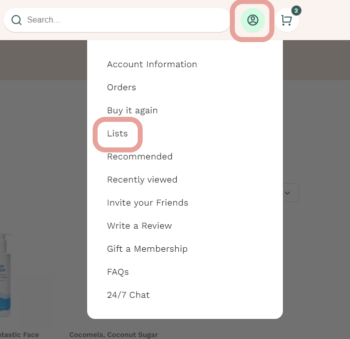 Once signed in, you can access your shopping lists by hovering your mouse over the Account icon next to the search bar.