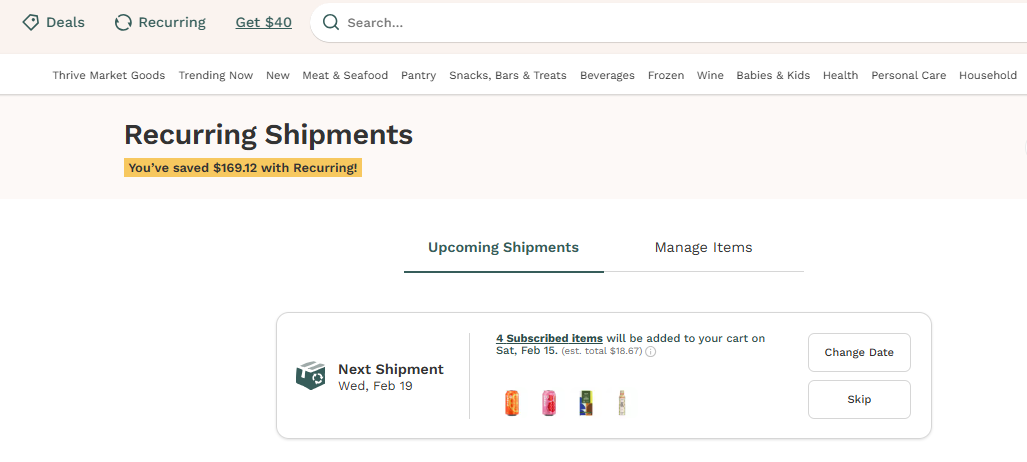 Navigate to your Recurring Shipment page by clicking here. Here, you can skip your upcoming order or change the shipment date via the "Change date" or "Skip" buttons.