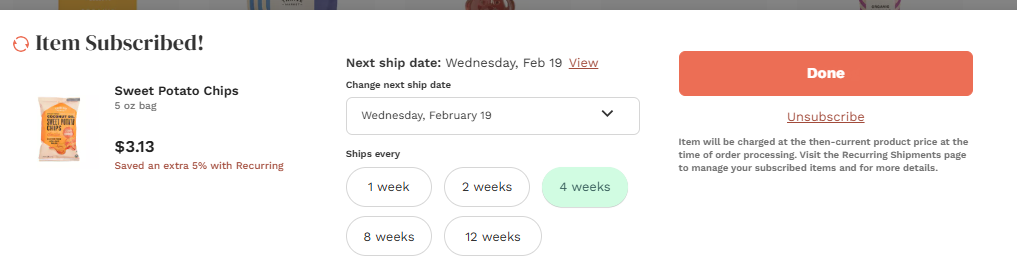 You will then be able to select your next ship date, preferred order frequency, and quantity. Click “Done” to save your preferences.