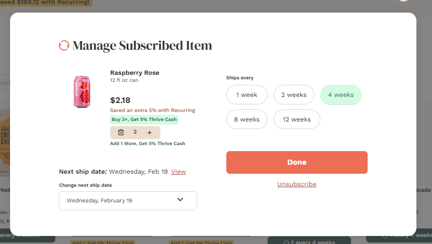 Here, you can edit the quantity, frequency, and next ship date of the item. You'll be able to choose to have the item included in your recurring order every 1, 2, 4, 8, or 12 weeks. Be sure to click "Done" to save your changes.