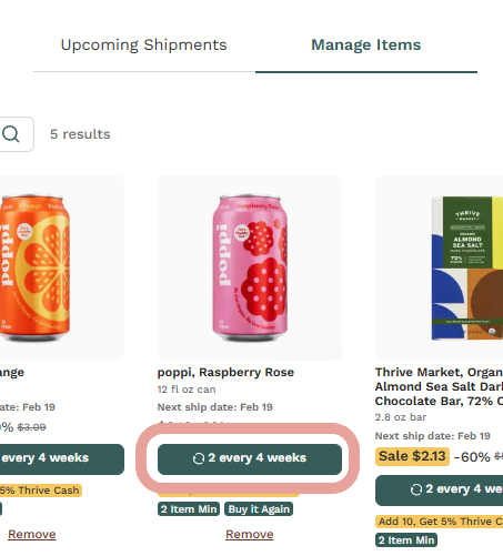 To adjust the quantity and frequency of your recurring items, first visit the "Manage Items" tab on your Recurring Shipments page here.