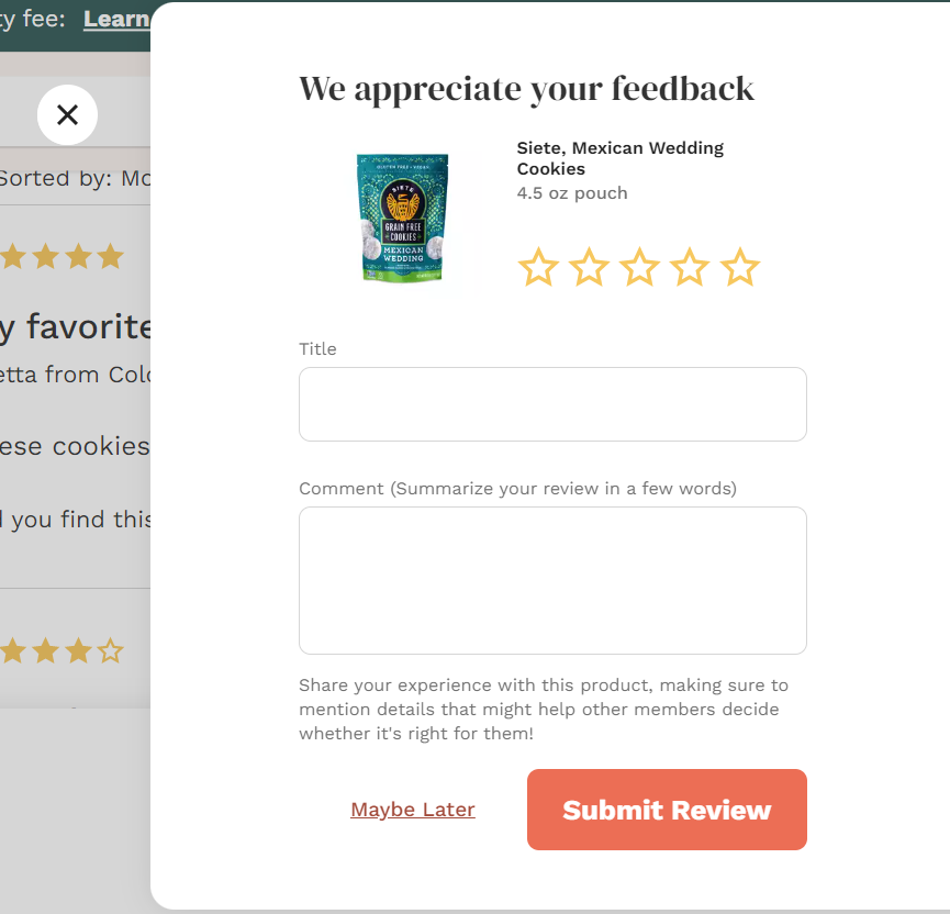 When you click that button, it will open a form for you. This is the blank canvas where you get to provide useful, constructive, and honest feedback. Have fun, and be as specific as you can! Your fellow Thrive Market members will thank you!