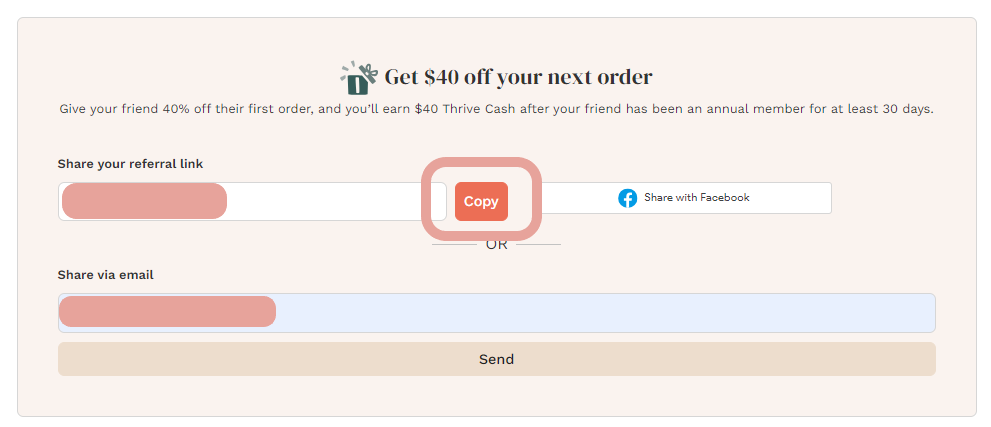 For each person who uses your link to register for the first time and becomes a paid annual member, you’ll get $40 in Thrive Cash after they are a member for 30 days. Thrive Cash will be automatically issued to your account on the 31st day after someone uses your referral link to sign up for a membership. Click here to learn more about referral credits.