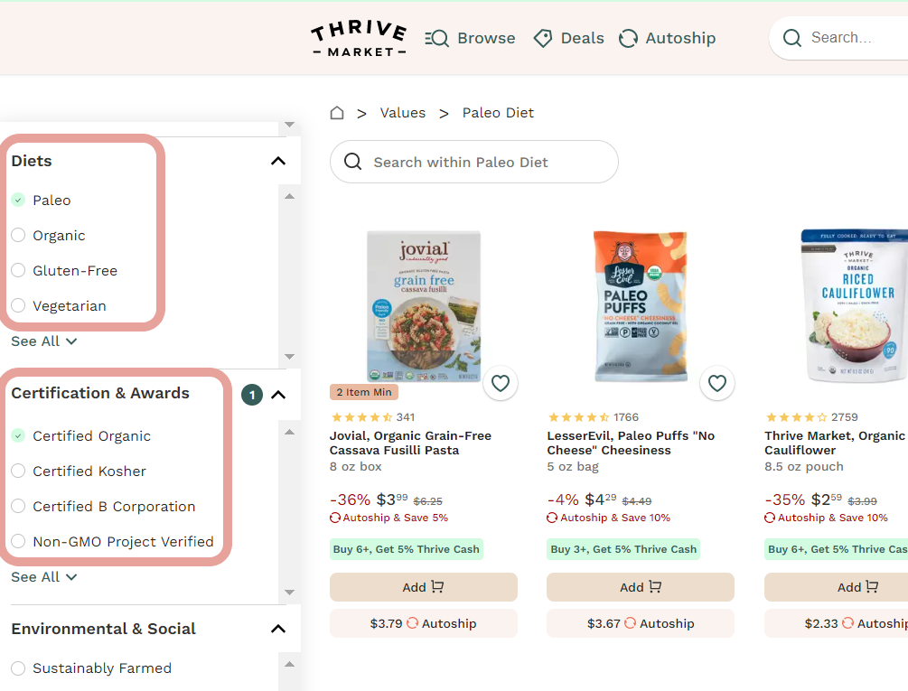 Simply select the filters that you'd like to apply on the left-hand side of any Aisle or search result page (in this case, Paleo, Certified Organic, and Recyclable):