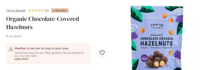 If we believe that the product will melt or be compromised by heat, it temporarily can’t be added to your cart. These restrictions are subject to change based on the forecast. Check back tomorrow to see if it’s safe to ship.