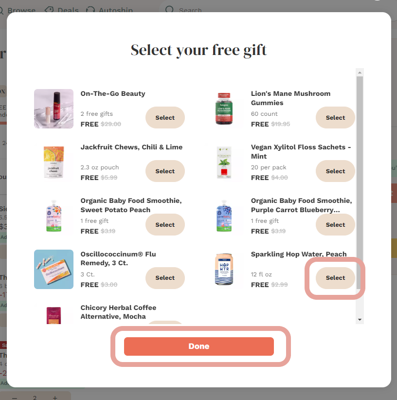 Select your free gift and click "Done" to add it to your cart.