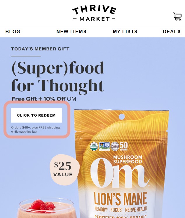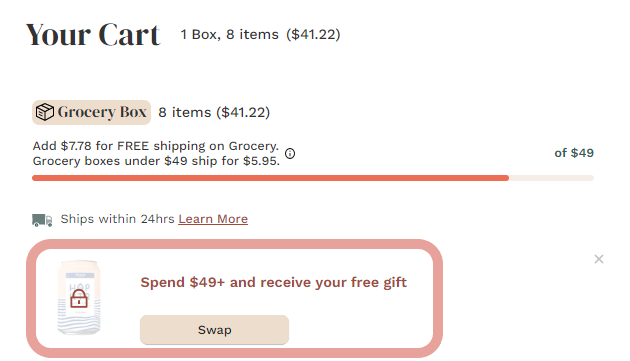 A cart total of at least $49 is the current minimum spending amount necessary to redeem a free gift. (Note: At this time, neither wine nor frozen orders count towards the minimum spending amount to redeem a free gift. The minimum spending amount to redeem a free gift may change per promotion. Please check your email or cart for requirements to redeem.).